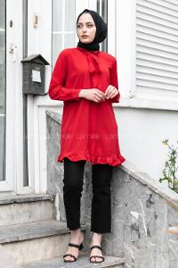 Modalamelif Önü Gizli Düğmeli Fırfırlı Tunik Kırmızı