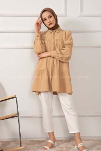 Modalamelif Önü Gizli Düğmeli Kol Lastikli Tunik Camel