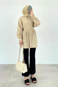 Modalamelif Önü Gizli Düğmeli Kuşaklı Tunik Bej