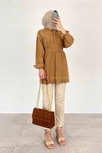 Modalamelif Önü Gizli Düğmeli Kuşaklı Tunik Camel
