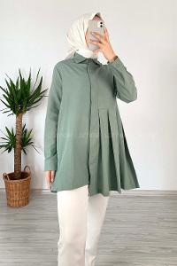 Modalamelif Önü Gizli Düğmeli Pileli Tunik Pastel Yeşili