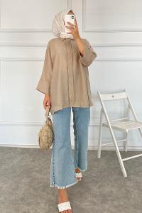 Modalamelif Önü Gizli Düğmeli Yara_sa Kol Gömlek Bej