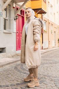 Modalamelif Önü Gizli Fermuarlı Kapşonlu Mont Taş Rengi