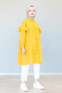 omuzları fırfırlı, göğüs kısmı robalı/büzgülü, etek ucuna doğru kat detaylı, bilekleri manşetli, bisiklet yaka, salaş tunik.