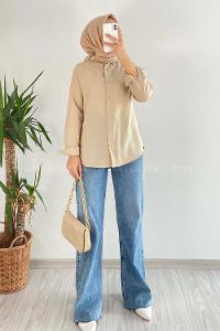 Modalamelif Önü Kısa Arkası Uzun Boydan Düğmeli Gömlek Bej
