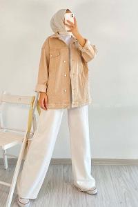 Modalamelif Önü Metal Düğmeli Kapak Cepli Salaş Kot Ceket Bej