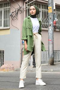 Lamelif Dekoratif Cep Detaylı Tesettür Ceket Haki