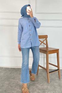 Modalamelif Önü Tahta Düğmeli Çift Cepli Gömlek Mavi