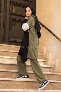 Lamelif Düğme Detaylı İkili Tesettür Takım Haki