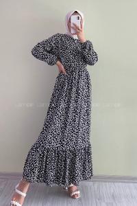 Modalamelif Önü Yarım Düğmeli Yonca Desenli Fırfırlı Elbise Siyah