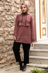 Modalamelif Önü Yarım Fermuar Detaylı Kapüşonlu Yırtmaçlı Tunik Gül