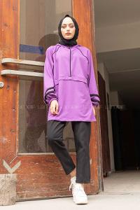 Modalamelif Önü Yarım Fermuarlı Balon Kol Sweatshirt Mor