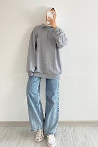 Modalamelif Önü Yarım Fermuarlı Etek Ucu Lastik Detaylı Sweat Gri