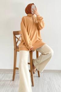 Lamelif Ön Fermuarlı Düz Sweatshirt Camel