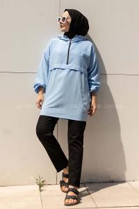 Modalamelif Önü Yarım Fermuarlı Kapüşon Detaylı Tunik Açık Mavi