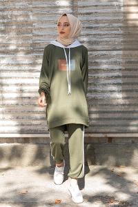 Modalamelif Önü Yazı Baskılı Garnili İkili Takım Haki