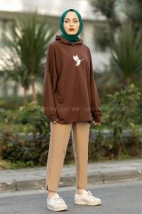 dek Nakışlı Kapüşonlu Sweat Acıkahve