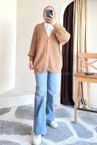 Modalamelif Örgü Desen Ön Düğmeli Hırka Karamel