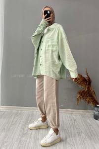 Lamelif Omuz Vatka Detaylı Tesettür Gömlek Yağ Yeşili