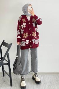 Modalamelif Papatya Desen Cepli Hırka Bordo