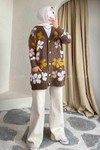 Modalamelif Papatya Desen Cepli Hırka Kahverengi