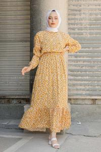 Lamelif Ön Yarım Düğme Detaylı Müslin Kumaş Tesettür Elbise Sarı