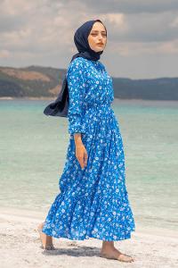 Lamelif Bel Büzgülü Tesettür Elbise Lacivert