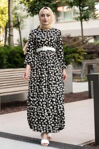 Modalamelif Papatya Desenli Beli Kemer Bağlamalı Elbise Siyah