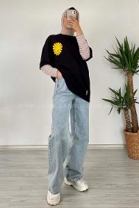 Modalamelif Papatya Nakışlı T-Shirt Siyah