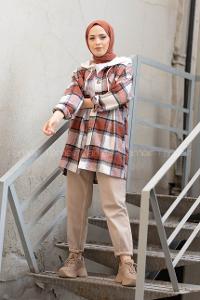 Modalamelif Penye Kapşonlu Ekose Oduncu Gömlek Kiremit
