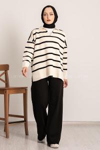 Modalamelif Polo Yaka Yırtmaç Detaylı Çizgi Desenli Kazak Ekru-Siyah