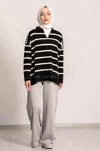 Lamelif Beyaz Çizgili Triko Kazak Siyah