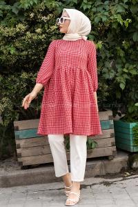 Modalamelif Pötikare Desenli Kolu Lastikli Gofre Tunik Kırmızı
