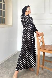 Modalamelif Puanlı Kuşak Bağlamalı Beli Lastikli Elbise Siyah