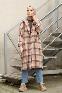 Modalamelif Reglan Kol Kapşonlu Ekose Kap Bej