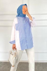 Modalamelif Renk Garnili Çizgi Deseen Detaylı Tek Cepli Gömlek Mavi