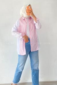 Modalamelif Renk Garnili Çizgi Deseen Detaylı Tek Cepli Gömlek Pembe