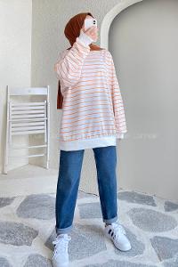 Modalamelif Renk Garnili Çizgi Desenli Sweat Beyaz-Turuncu