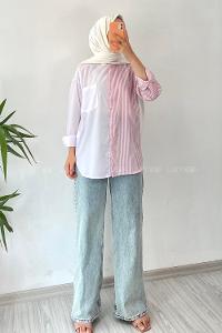 Modalamelif Renk Garnili Çizgi Detaylı Tek Cepli Gömlek Pembe-Beyaz