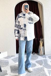 Modalamelif Renk Garnili Etnik Desen Kapak Cep Gömlek Ekru-İndigo