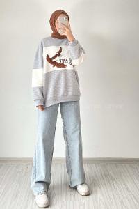 Modalamelif Renk Garnili Kartal Nakışlı Sweat Gri