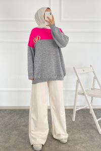 Modalamelif Renk Garnili M Baskılı Triko Kazak Gri-Fuşya