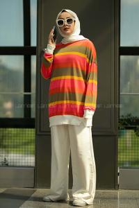 Modalamelif Renk Garnili Şerit Desenli Bisiklet Yaka Sweat Çokrenkli