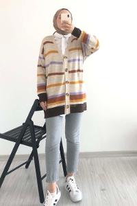 Modalamelif Renk Garnili Şerit Geçişli Triko Hırka Bej