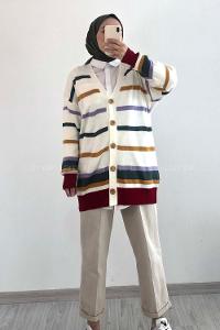 Modalamelif Renk Garnili Şerit Geçişli Triko Hırka Ekru