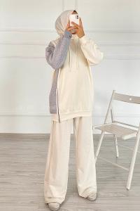 Lamelif Balon Kol Yaka Ve Etek Ucu Manşetli Bol Sweat Ekru