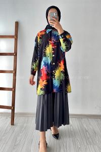 Modalamelif Renkli Püskürtme Desenli Önü Düğmeli Gömlek Siyah