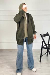 Modalamelif Saç Örgü Kapüşon Detaylı Çift Cepli Hırka Haki