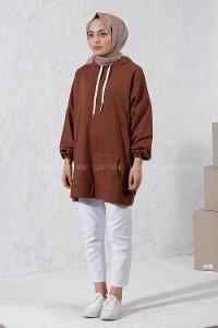 Lamelif Kapüşon Yaka Cepli Sweatshirt Kahverengi