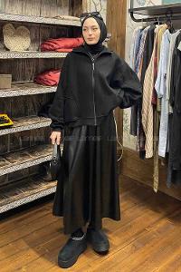 Lamelif Şardonlu Fermuarlı Hırka Siyah